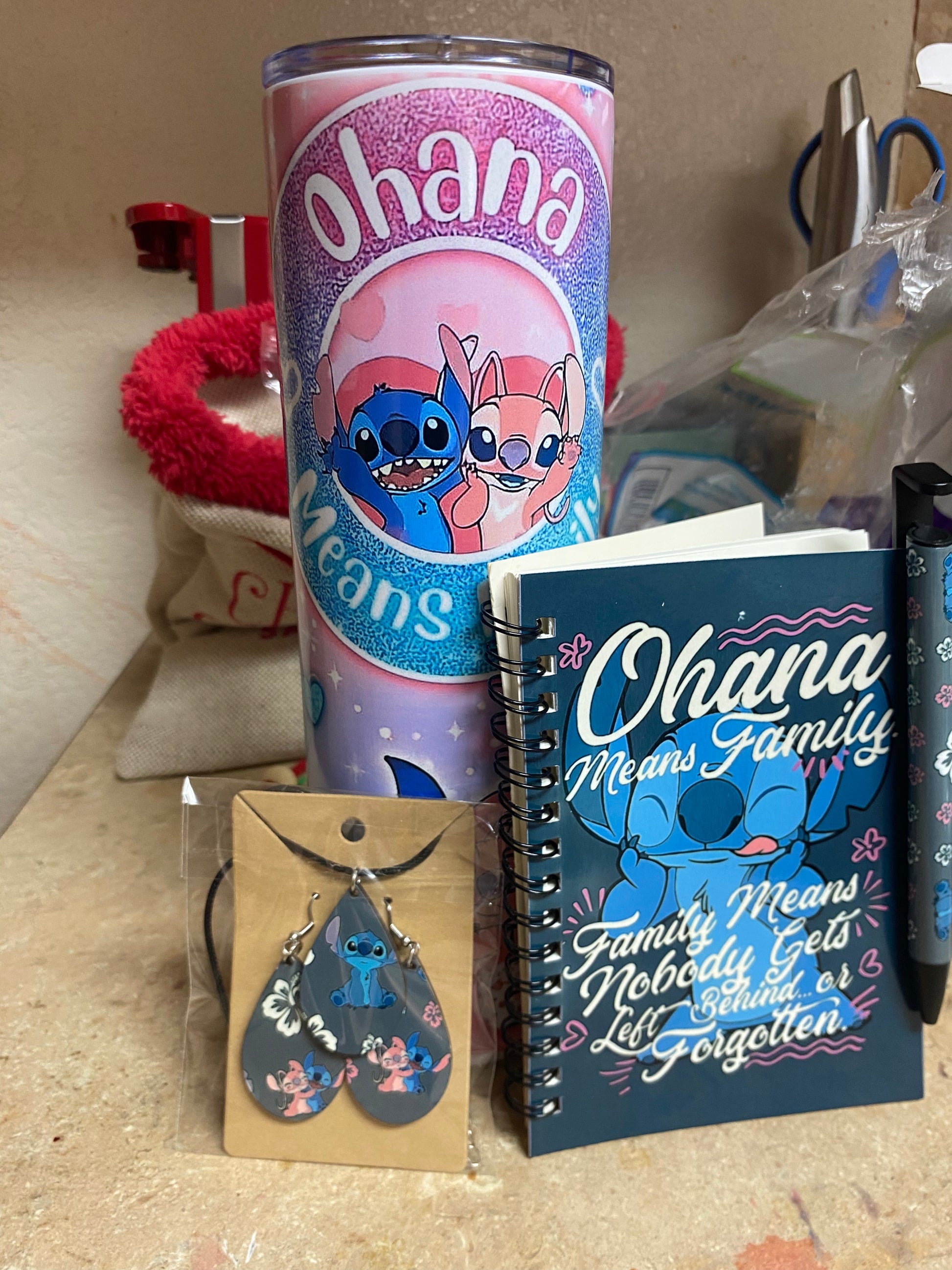 Comes with a 30oz skinny tumbler, notebook and pen and also earrings and a necklace